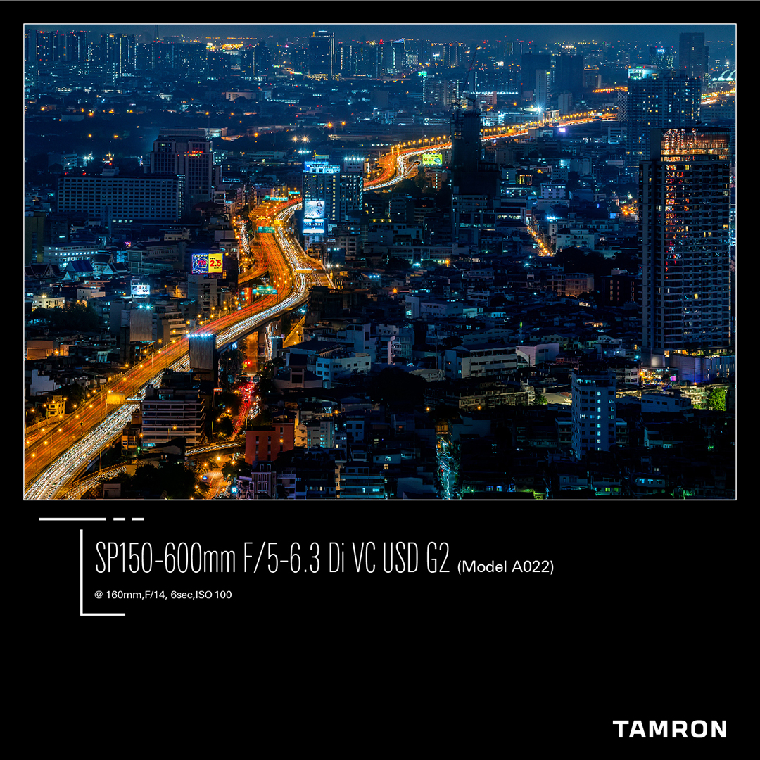 จากนั้นขยับทำเลไปแถวสีลมขึ้นไปชั้นบนของโรงแรมเลอบัว แอท สเตท ทาวเวอร์ ที่ถือเป็นตึกสูงอันดับต้นๆของกรุงเทพโดมสีทองชั้นที่67 กับมุมมอง 360 องศา ทำให้เลนส์Tamron SP 150-600mm F/5-6.3 Di VC USD G2 (Model A022) สามารถเก็บภาพเส้นแสงไฟของรถบนทางด่วนยกระดับยาวสุดลูกหูลูกตา ทั้งเส้นแสงสีแดง และแสงสีเหลืองการจะเก็บเส้นแสงนี้มักใช้หน้ากล้องประมาณ F/8 – F/11 เพื่อไม่ให้เส้นแสงฟุ้งไป หรือเล็กเกินไปนั่นเอง