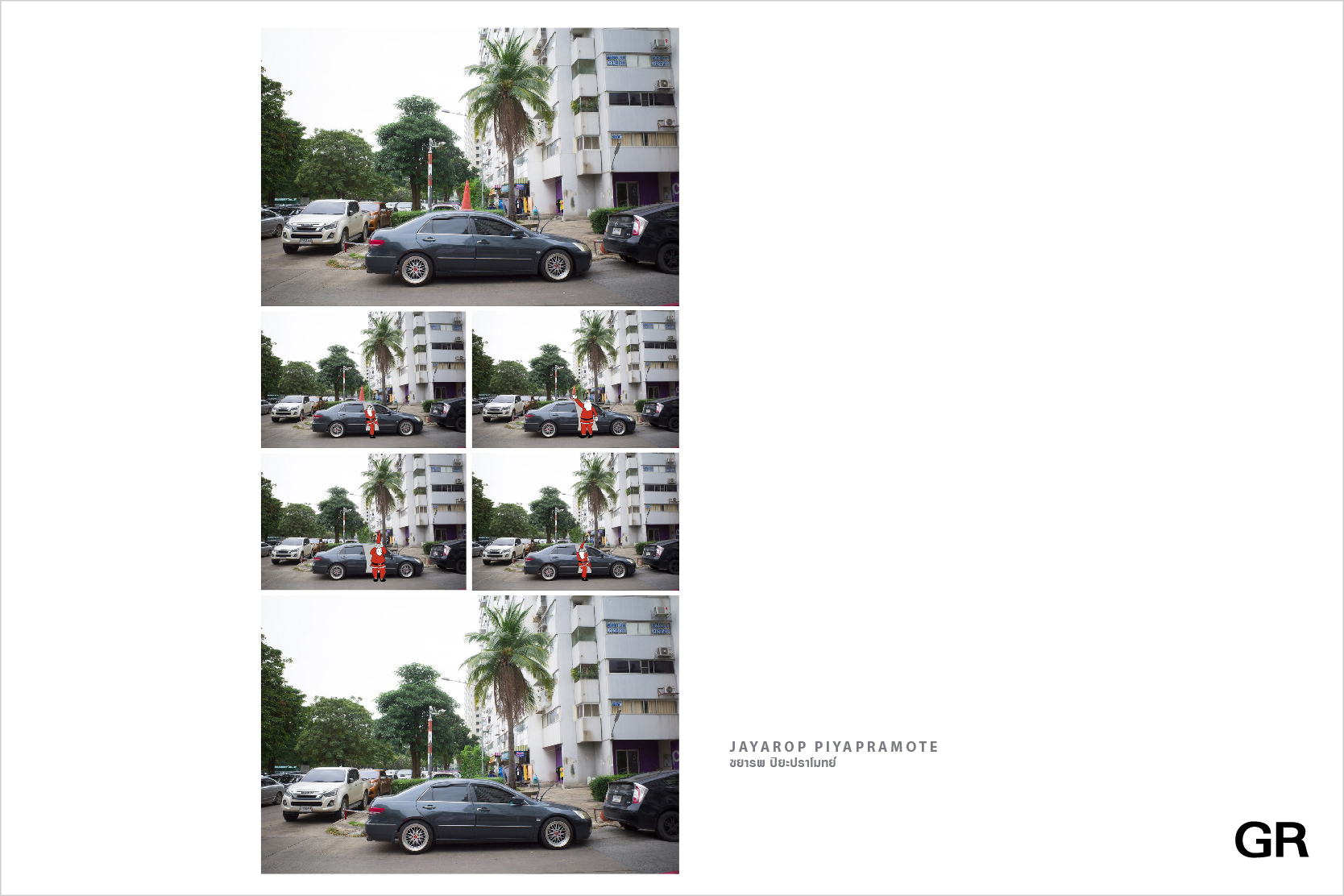 ในการถ่ายภาพสตรีทฯ ในแบบของผม จึงเหมือนการใช้กล้อง GR เป็นเครื่องมือที่จะใช้ในการสำรวจ หรือสังเกตการณ์อะไรบางอย่างที่น่าสนใจที่มันกำลังเกิดขึ้น หรืออาจจะกำลังเกิดขึ้นในเร็วๆ นี้ แล้วสามารถบันทึกภาพเหล่านั้นกลับมาได้ การได้สะสมโมเมนต์เหล่านี้เป็นความสุขในการถ่ายภาพแบบของผมเอง อาจจะเก็บเอาไว้ดูคนเดียว หรืออาจเรียบเรียงออกมาเป็นผลงานภาพที่สามารถแบ่งปันออกไปได้ไม่รู้จบ แต่ความรู้สึกใดๆ ก็ตามที่มีอยู่ในผลงานไม่ว่าจะเป็นความสนุก อารมณ์ขัน ตลกร้าย การจะสื่อสารมันออกไปได้มันก็เริ่มต้นจากที่เราเฝ้าสังเกต และเก็บภาพมาให้ทันซะก่อน