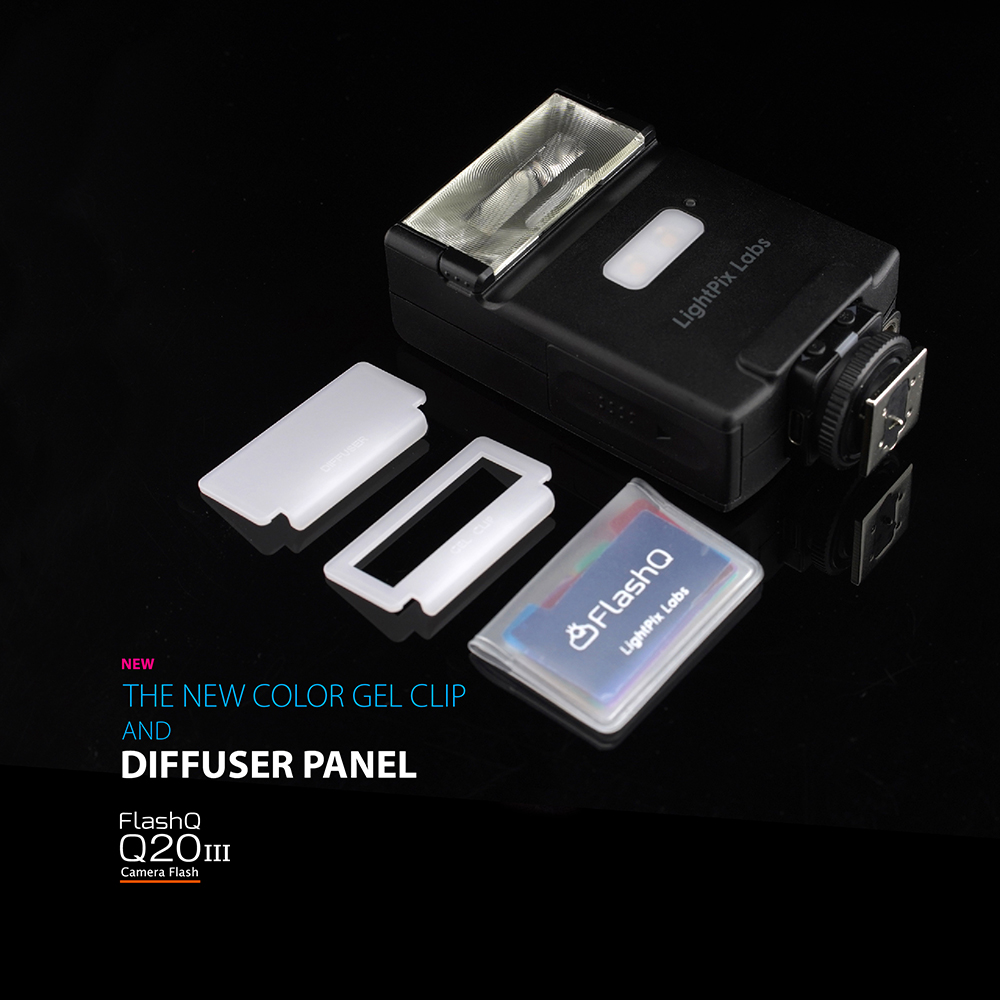 The NEW color gel clip and diffuser panel รุ่นนี้ออปแบบที่ใส่เจลสี (มีเจลสีให้เลือกใช้ 7 สี) และแผ่นกรองแสงใหม่ (Diffuser) โดยสามารถสวมเข้าล็อกที่ด้านหน้าแฟลชเลย ช่วยให้การเปลี่ยนเจลสีขณะถ่ายภาพดึงเข้า-ออกได้สะดวก รวดเร็วขึ้น เวลาเลิกใช้งานก็ปลดล็อกเก็บใส่กระเป๋าได้ทันที