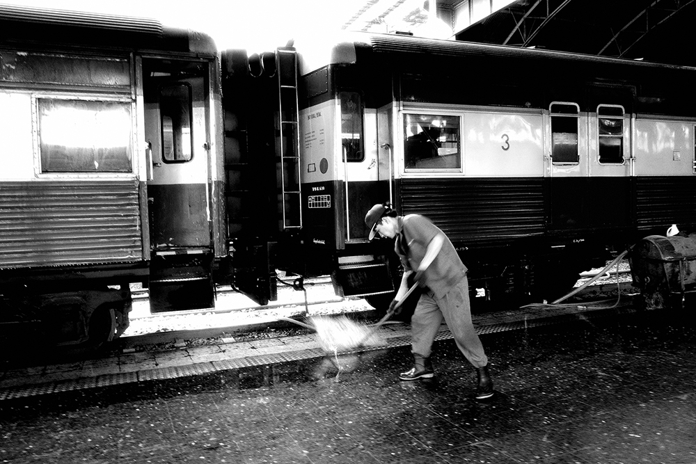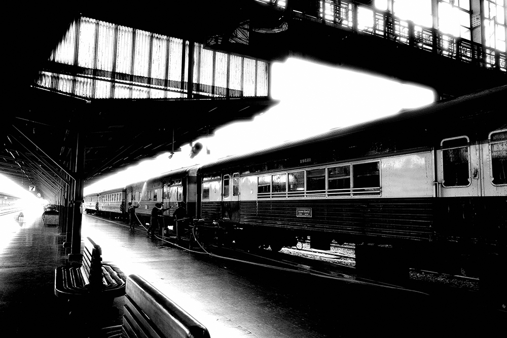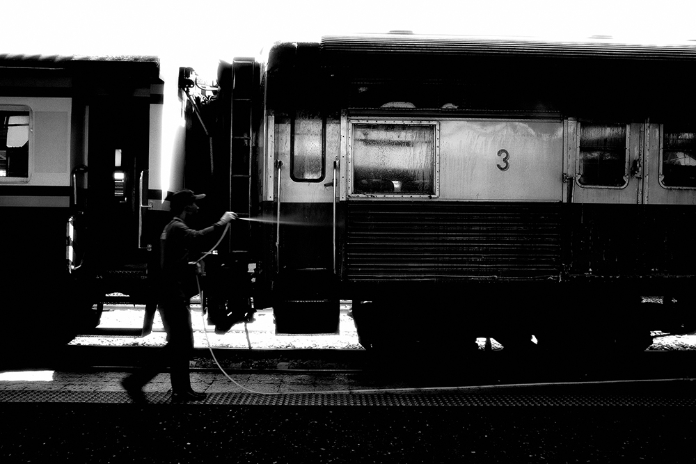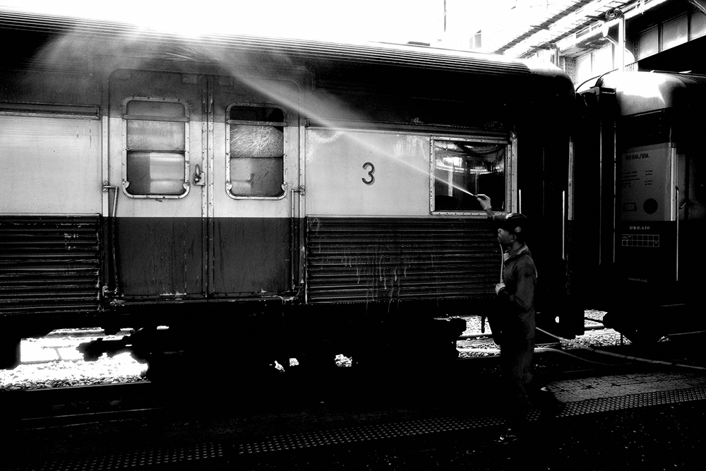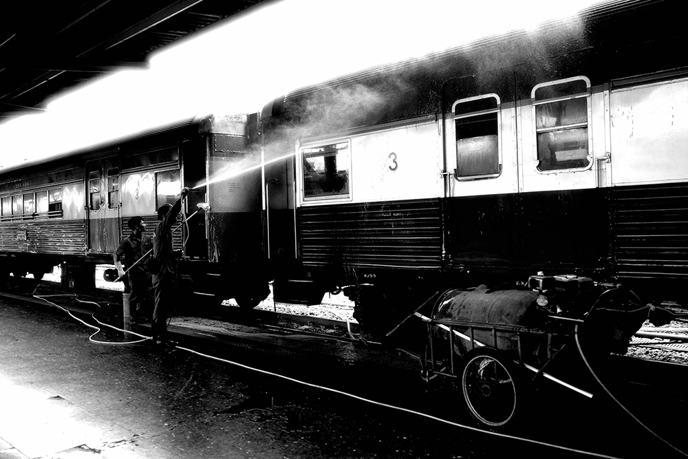 เชื่อว่าใครที่เคยมารอขึ้นรถไฟ น่าจะเคยเห็นเขาล้างทำความสะอาดโบกี้รถไฟกัน วันนี้มาถึงก่อนเวลา ก็เลยเดินเข้ามาในชานชลา เห็นพี่ๆ กำลังฉีดน้ำ ขัดๆ ถูๆ ทำความสะอาดพอดีก็พุ่งเข้าใส่ซิครับ