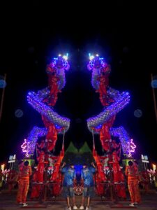 พอจบพลุภายใน 5 นาที ก็เดินกลับมาลานหน้าเวที กำลังจะมีเชิดสิงโต กับเชิดมังกร 2 ตัว ได้โอกาสลองเทคนิคSlow sync flash, Reflection ก็พอถูๆ ไถๆ เพราะคุมค่าต่างๆ ยากกว่าใช้กล้องMirrorless ที่ควบคุมได้แบบ100% ภาพที่ได้ก็ไม่ขี้เหร่นะ ..แต่เรายังไม่ชินกับจังหวะกล้อง เวลายิงแฟลชต้องรอแป๊บนึง..ขัดใจหน่อย บางซีนแฟลชมันดันเบายิงไม่ถึง 555 แต่อย่าลืมว่ากล้องPentax WG-1000 มันตัวไม่ถึงหมื่นนะได้ประมาณนี้ก็สุขใจแล้ว