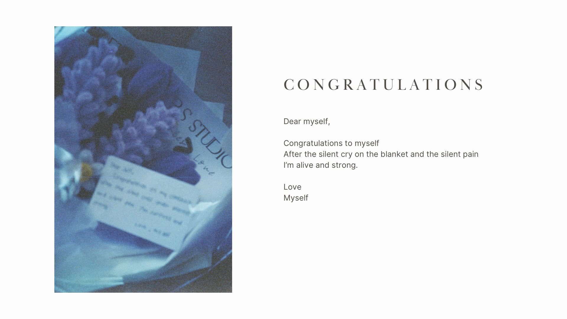 มอบช่อดอกไม้ที่ชอบ และแสดงความยินดีกับการมีอยู่ของตัวเอง หลังผ่านการร้องไห้ใต้ผ้าห่มที่ไม่มีใครได้ยินและแผลใจมากมายที่ไม่มีใครรับรู้ เธอยังคงอยู่และแข็งแรงดี เก่งมากก