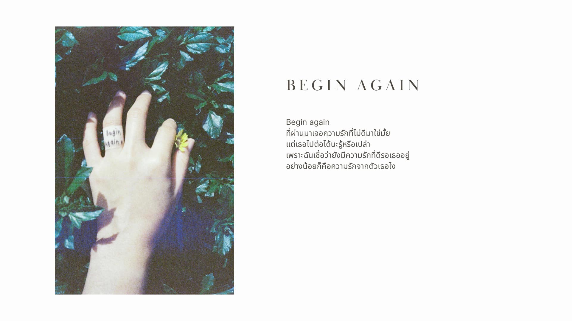 เพียงเพราะเจอความรักที่เจ็บปวดมา ไม่ได้หมายความว่าความรักที่ดีไม่มีอยู่จริง ฉันยังคงเชื่อเรื่องความรัก อย่างน้อยที่สุดฉันเริ่มผันแผลและกอบกู้เศษหัวใจที่แตกสลาย ก่อร่างสร้างความรักใหม่ครั้งใหม่ด้วยการรักตัวเอง