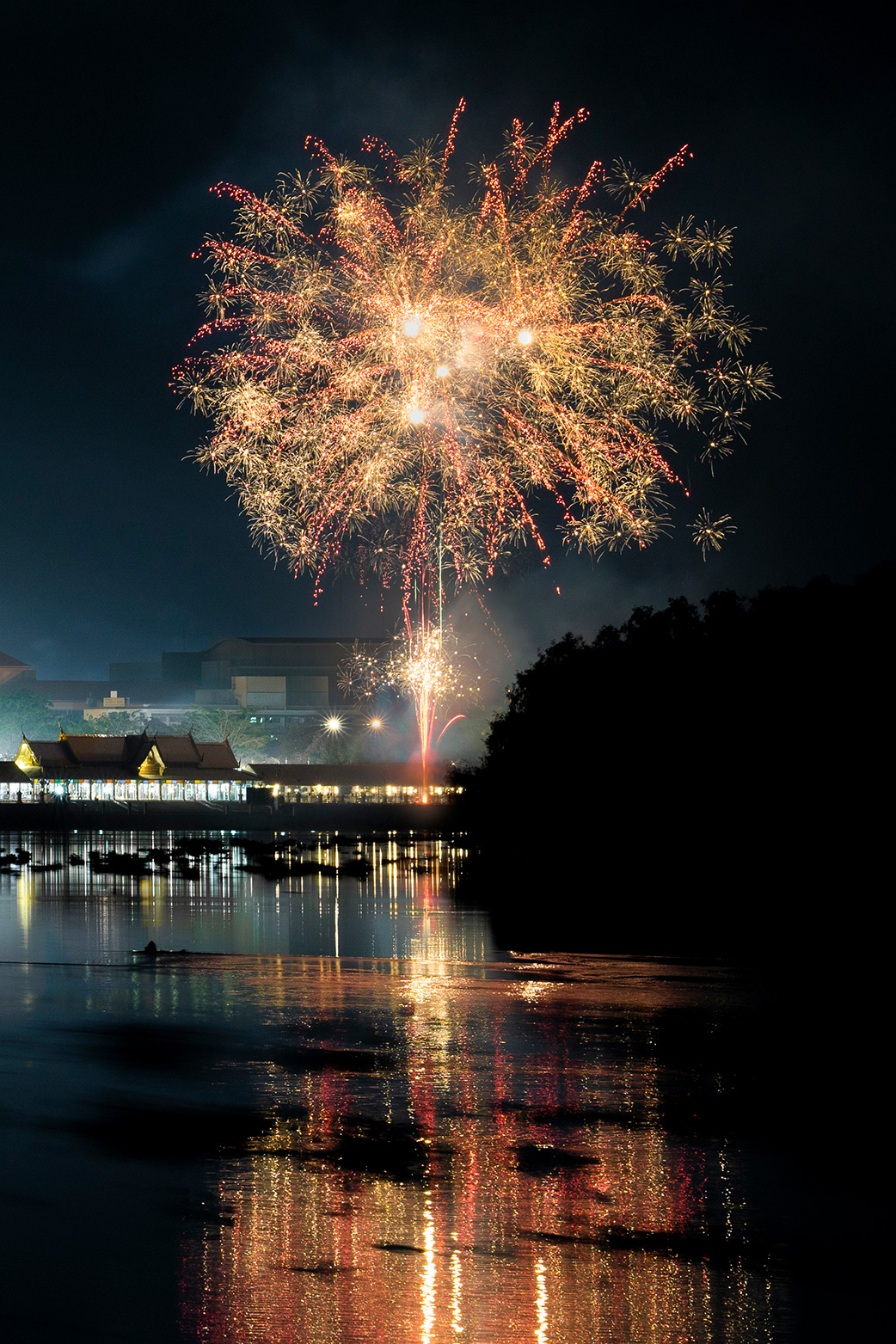 พอใกล้เที่ยงคืนก็แบกขาตั้งกล้องไปริมน้ำ ปรับตั้งค่ากล้องเสียบสายลั่นชัตเตอร์ ยืนตบยุงรอเวลาCountdown และแล้วการรอคอยก็ไม่เสียเปล่า.. ปีนี้จุดเยอะกว่าเดิม และมีเซอร์ไพรส์จุดพลุชุดที่สอง !!! ห่างกันไม่กี่นาที ดีนะที่ยืนเช็ครูปยังไม่ทันเก็บขาตั้งกล้อง เวลากดชัตเตอร์ก็อาศัยมองพลุที่สว่างขึ้นมาในแต่ละตำแหน่ง ถ้าเปิดนานไปพลุก็จะสว่างเว่อร์เกินไป สีจืดไม่สวย ปีนี้จุดจากหลายที่ และหลากหลายขนาด จึงทำให้มุมหน้าที่เป็นผืนน้ำมีความสว่างหลากสีสัน เสียดายโบสถ์กำลังบูรณะปฎิสังขรจึงแลดูมืดไปหน่อย