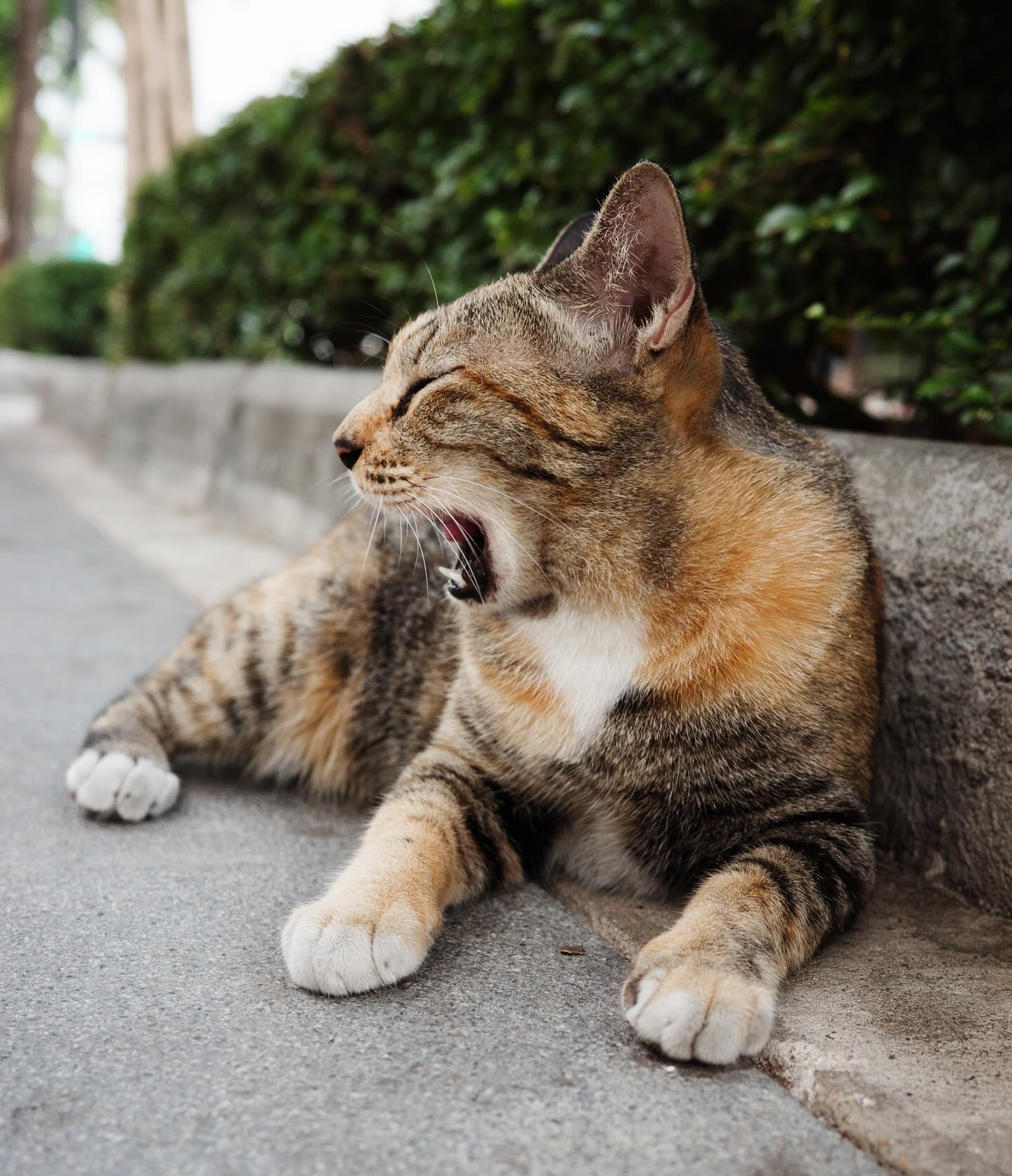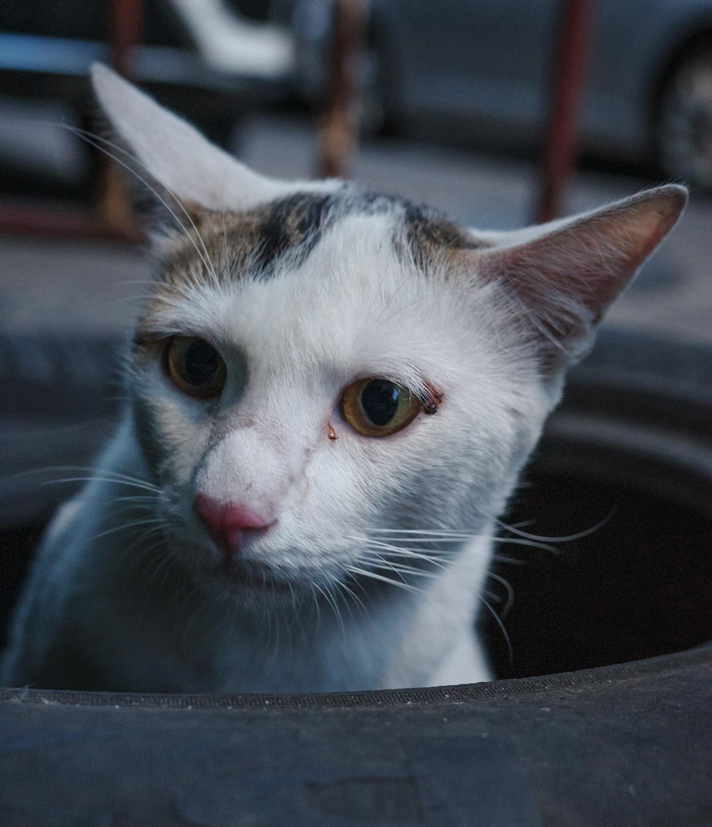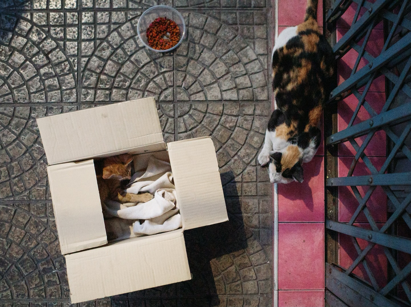 “แม่แมวนอนเฝ้า ลูกแมวส้มที่ไม่สบาย มีคนที่อยู่แถวนี้เอาแมวส้มใส่กล่องไว้ป้องกันอันตรายที่อาจจะเกิดจากแมวหรือสุนัขตัวอื่นมา”