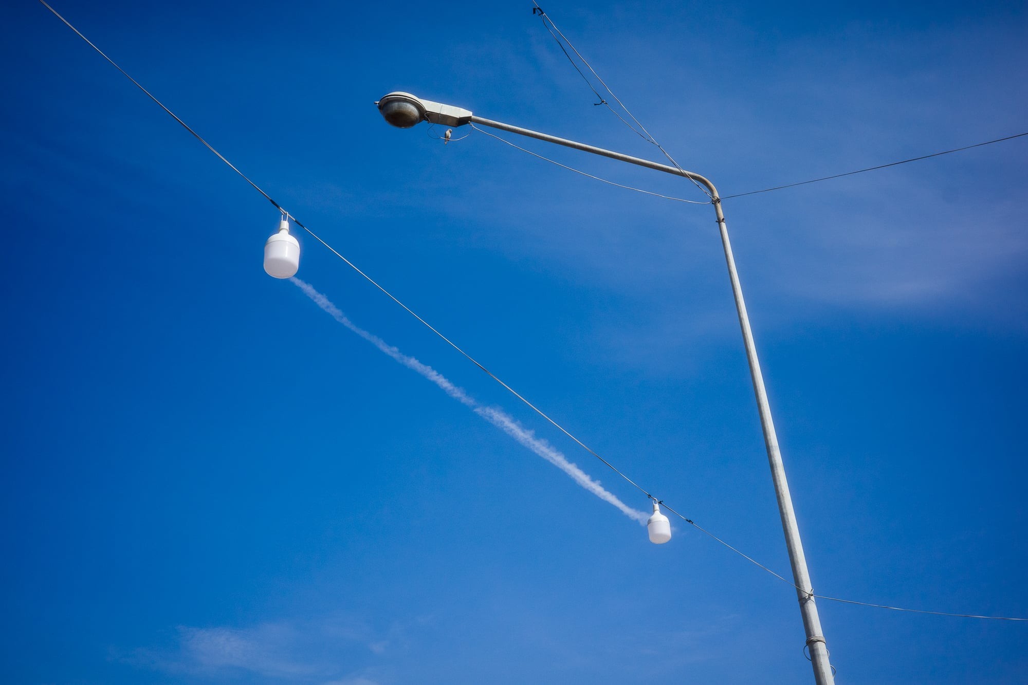เราจอดรถเสร็จ เปิดประตูมองขึ้นไปบนฟ้า ก็เจอซีนนี้เลย ท้องฟ้ามีเส้นของไอพ่นเครื่องบิน เรารู้สึกว่ามันน่าสนใจดีก็เลยพยายามมองหาForeground ..เห็นหลอดไฟ 2 หลอดเรียงคู่กัน ก็คิดเชื่อมโยง หรือต่อกันกับเมฆก็น่าจะโอเคนะซีนนี้ถ่ายทั้งแนวตั้ง และแนวนอน