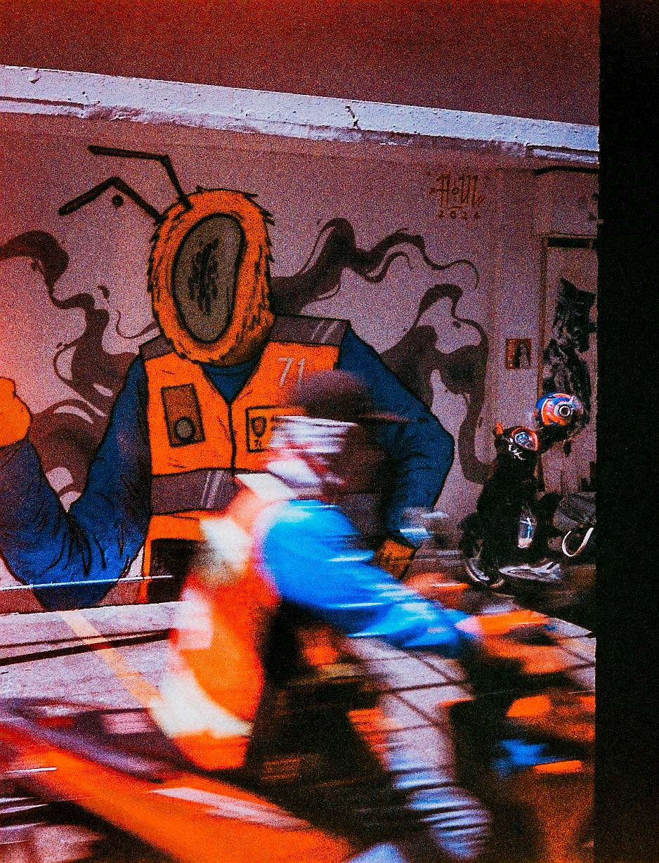 ภาพนี้ทำให้เข้าใจจังหวะการทำงานของกล้องมากขึ้น ตอนกดชัตเตอร์คิดว่าคงไม่ได้จังหวะภาพนี้ เพราะกดได้แค่ทีเดียว และรู้สึกว่ากดช้าไปกว่ากลไกกล้องจะทำงานเหมือนจะดีเลย์ และคิดว่าไม่น่าจะถ่ายติดวินมอเตอร์ไซค์ จะถ่ายซ่อมก็ไม่ได้เพราะเป็นซอยตันและไม่มีวินมอเตอร์ไซค์แต่งตัวแบบนี้ ในใจเลยตีเป็นภาพเสียไปแล้ว พอดูภาพที่ล้างออกมาเลยได้รู้ว่า กล้องมันเปิดม่านตั้งแต่ตอนที่เรากดชัตเตอร์แล้ว