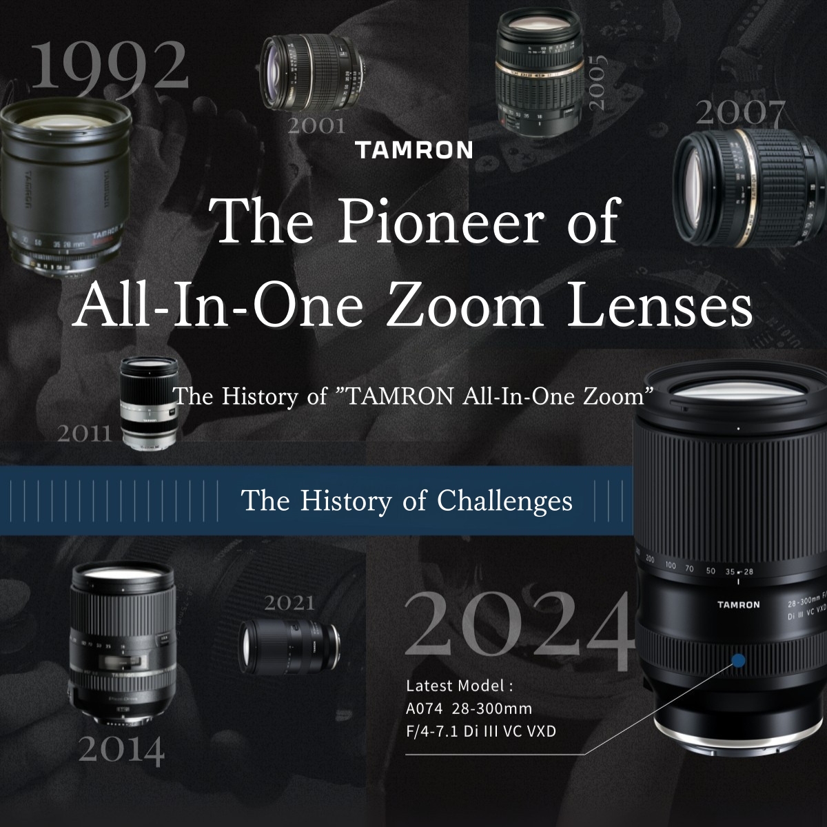 โดยเลนส์กลุ่มนี้นักถ่ายภาพทั่วโลกให้การตอบรับเป็นอย่างดีมาตลอด จนให้นิยามว่าเป็น”เลนส์เดียวเที่ยวทั่วโลก” เมื่อเข้าสู่ระบบดิจิทัลการจัดเรียงโครงสร้างเลนส์ การเคลือบผิวเลนส์ ล้วนถูกพัฒนาให้สอดคล้องกับกำลังการแยกขยายของชิ้นแก้ว ประสิทธิภาพของเลนส์ในกลุ่มนี้จึงสร้างปรากฏการณ์ใหม่ให้กับช่างภาพในระดับกึ่งจริงจัง และมืออาชีพ ได้ทึ่งถึงคุณภาพผลงานที่ยอดเยี่ยมกว่ายุคฟิล์มไปไกล โดยเฉพาะเลนส์ 28-200mm F/2.8-5.6 Di III RXD (Model A071) ที่เปิดตัวในปี 2021 นั้นให้ค่ารูรับแสงเริ่มต้นที่สว่างถึง F/2.8 และปี 2024 ออกเลนส์เอนกประสงค์ตัวใหม่เป็นระยะ 28-300mm ที่ห่างหายไปนาน โดยมีความคมชัดสูงหวังผลที่การซูมสุดปลายกระบอกได้ นี่จึงเป็นการตอกย้ำถึงความมุ่งมั่นในปณิธานที่ TAMRON ได้สร้างสรรค์เลนส์ ALL-IN-ONE มาอย่างต่อเนื่องยาวนานกว่า 32 ปี