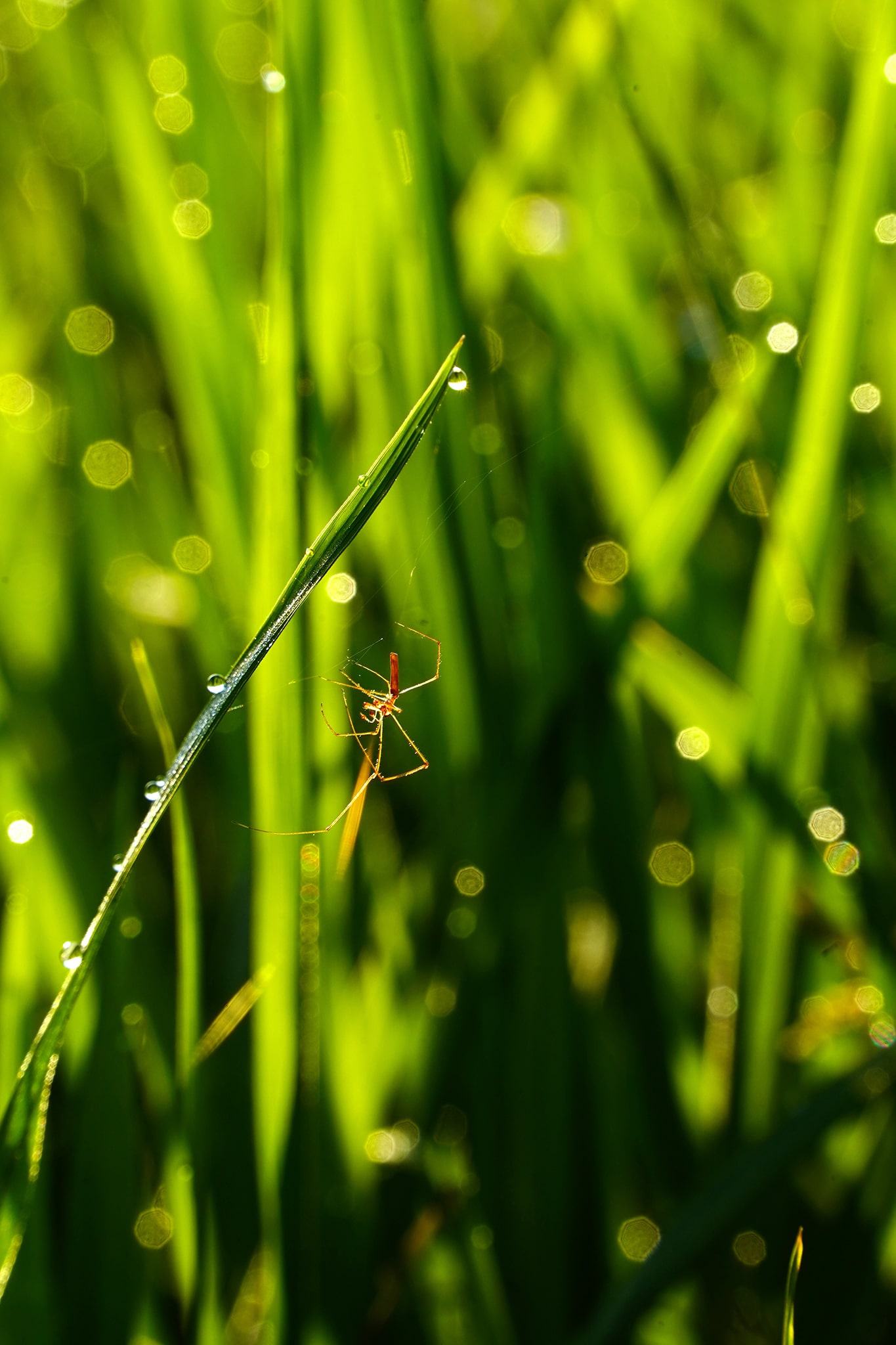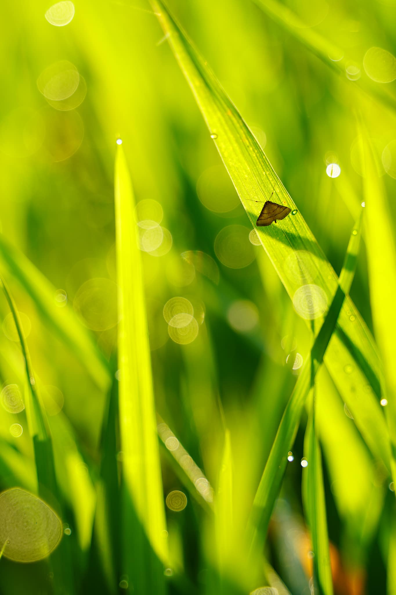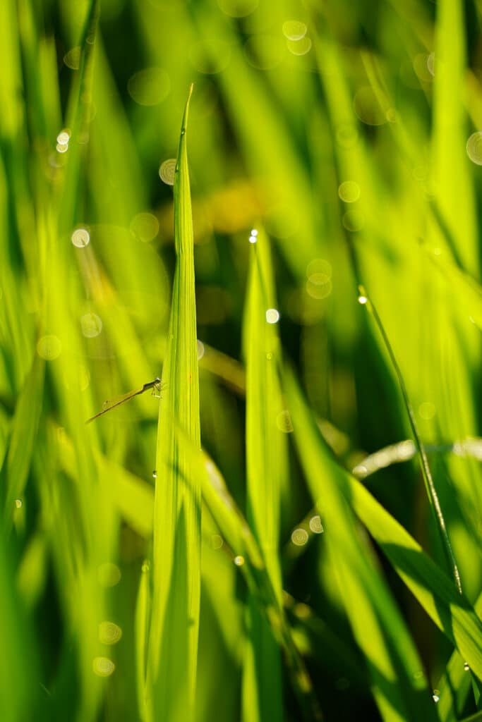 แสงแดดกระทบน้ำค้างยามเช้า เป็นซีนที่นักถ่ายภาพต้องยอมตื่นมาถ่ายภาพ เพราะพอแดดแรงหน่อยน้ำค้างก็จะระเหยไปหมด จากภาพจะเป็นต้นข้าวในท้องนา มีแมงมุม แมลงปอ ผีเสื้อ ที่เรามองหามาเข้าเฟรม เพื่อให้ภาพมีมิติ มีเรื่องราวเพิ่มมากขึ้น โดยพยายามหาใบที่มีน้ำค้างเกาะมาเป็นฉากหน้า (Foreground) จะได้เกิดโบเก้ (Bokeh) ขนาดใหญ่ ไล่ขนาดไปตามระยะห่างจากเลนส์ มิติของภาพก็จะสวยงามตามท้องเรื่อง.. จากการใช้ประโยชน์ช่วงระยะเทเลโฟโต้ของเลนส์อเนกประสงค์